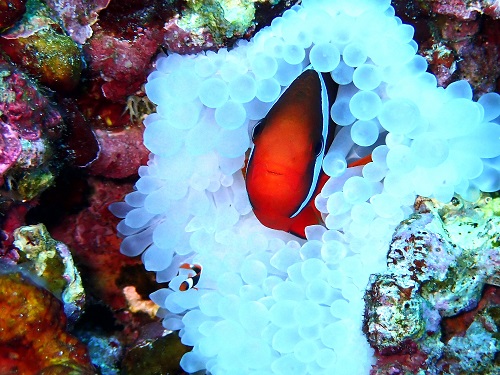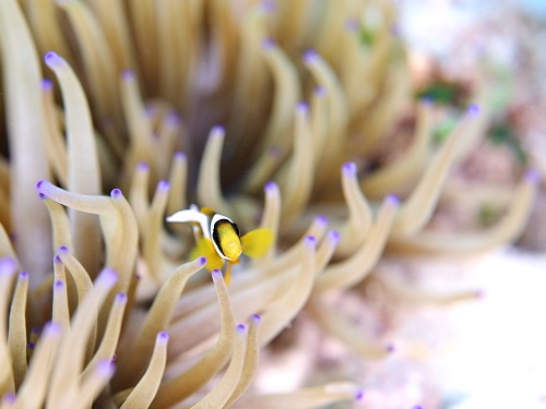 ここのポイントのイソギンチャクは年中白化してて