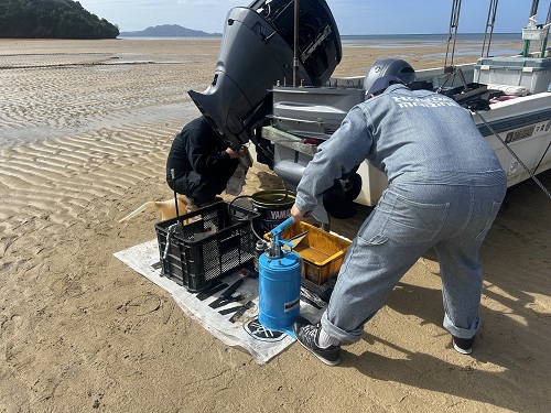 そして、潮が引いたタイミングに船のオイル交換もしに来て頂きました。